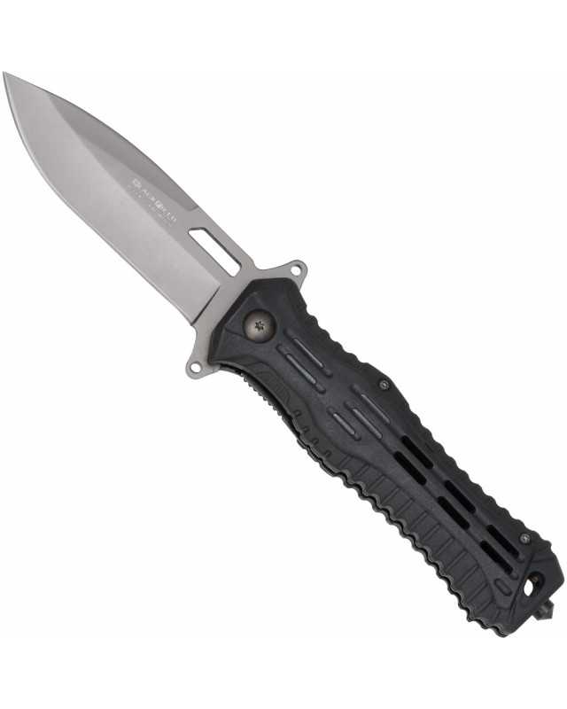 Die titanbeschichtete Klinge kann mit Hilfe des Flippers blitzschnell geöffnet werden. Der Griff aus Kunststoff ist an der Daumenauflage gummiert und liegt daher sicher in der Hand. Das Messer verfügt außerdem über einen Glasbrecher und einen Gürtelclip.